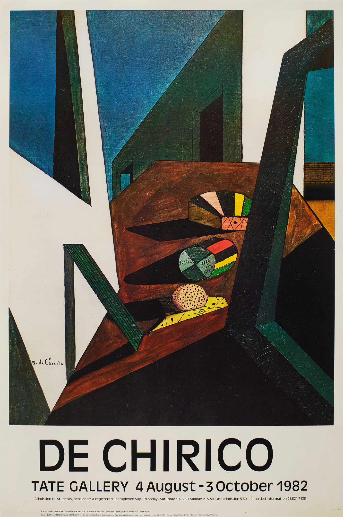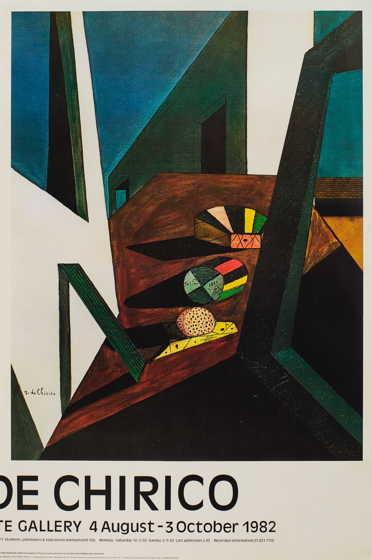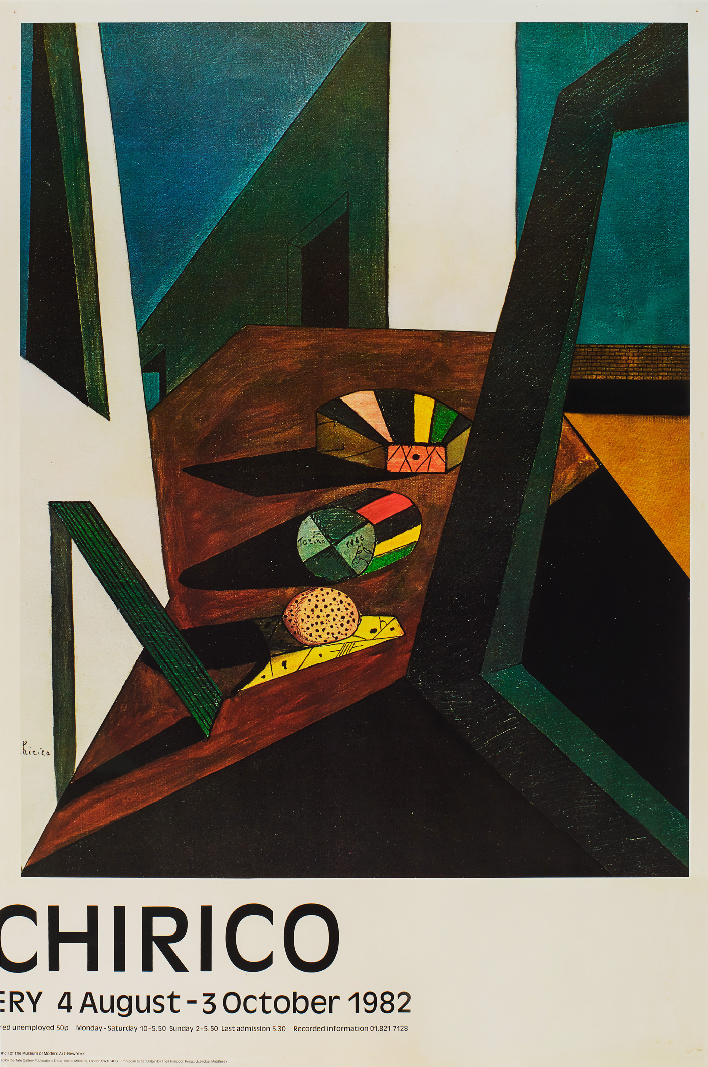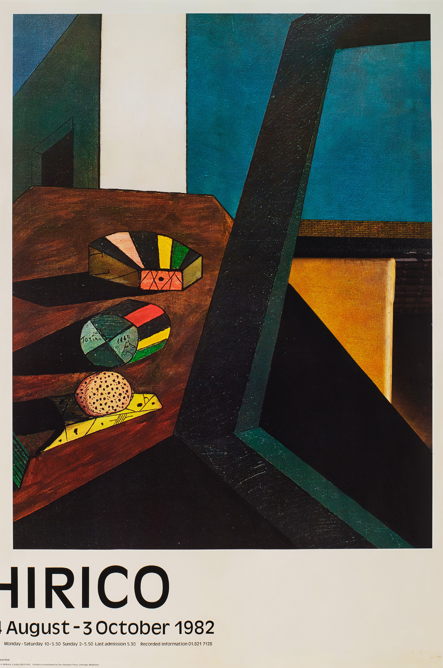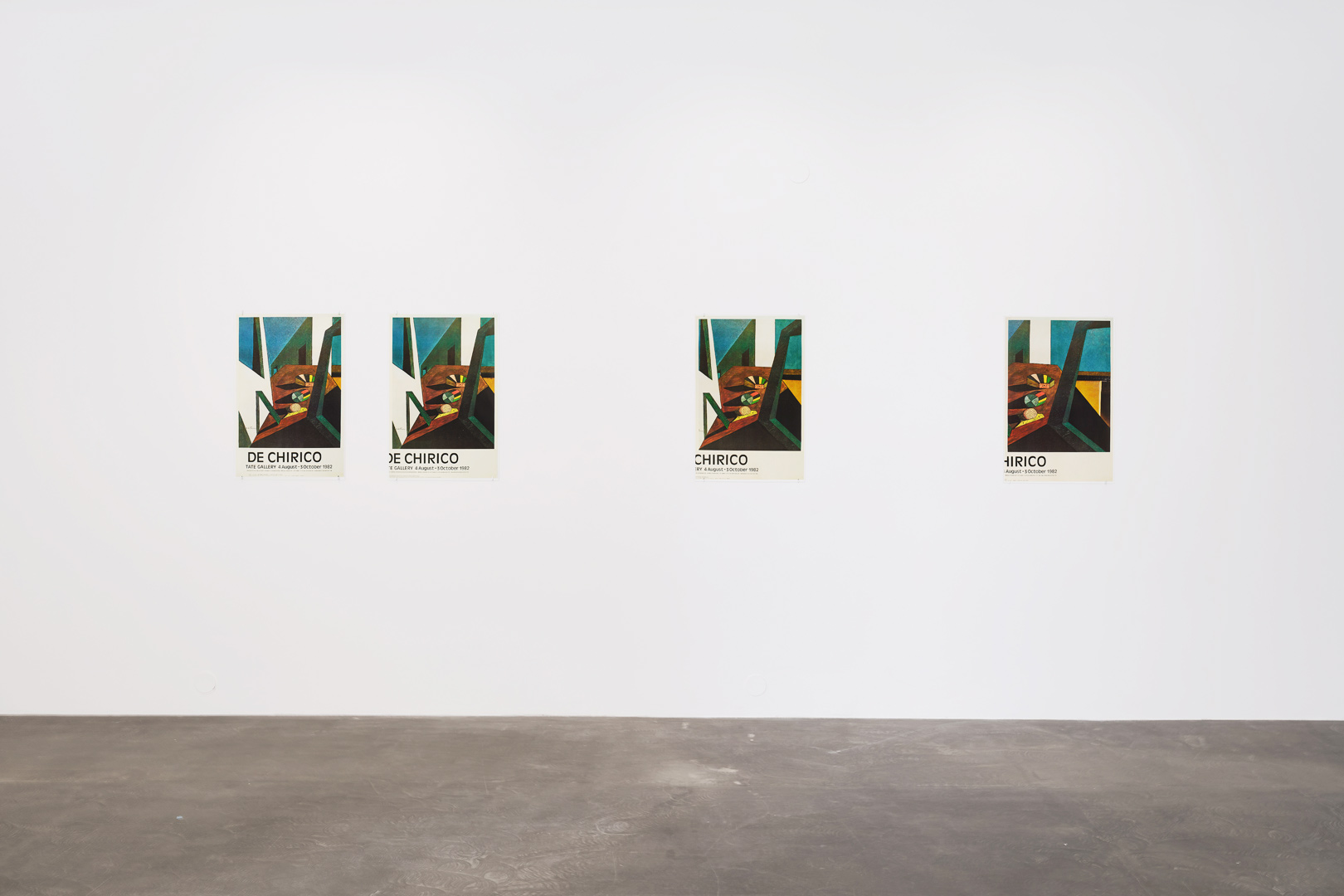 The suite of four exhibition posters that compromise Off Set appear to be out of register. As if looking through the arches of a cloister, the consecutive views of the de Chirico scene shifts subtly in perspective from one image to next, gradually revealing the very edge of its construct.